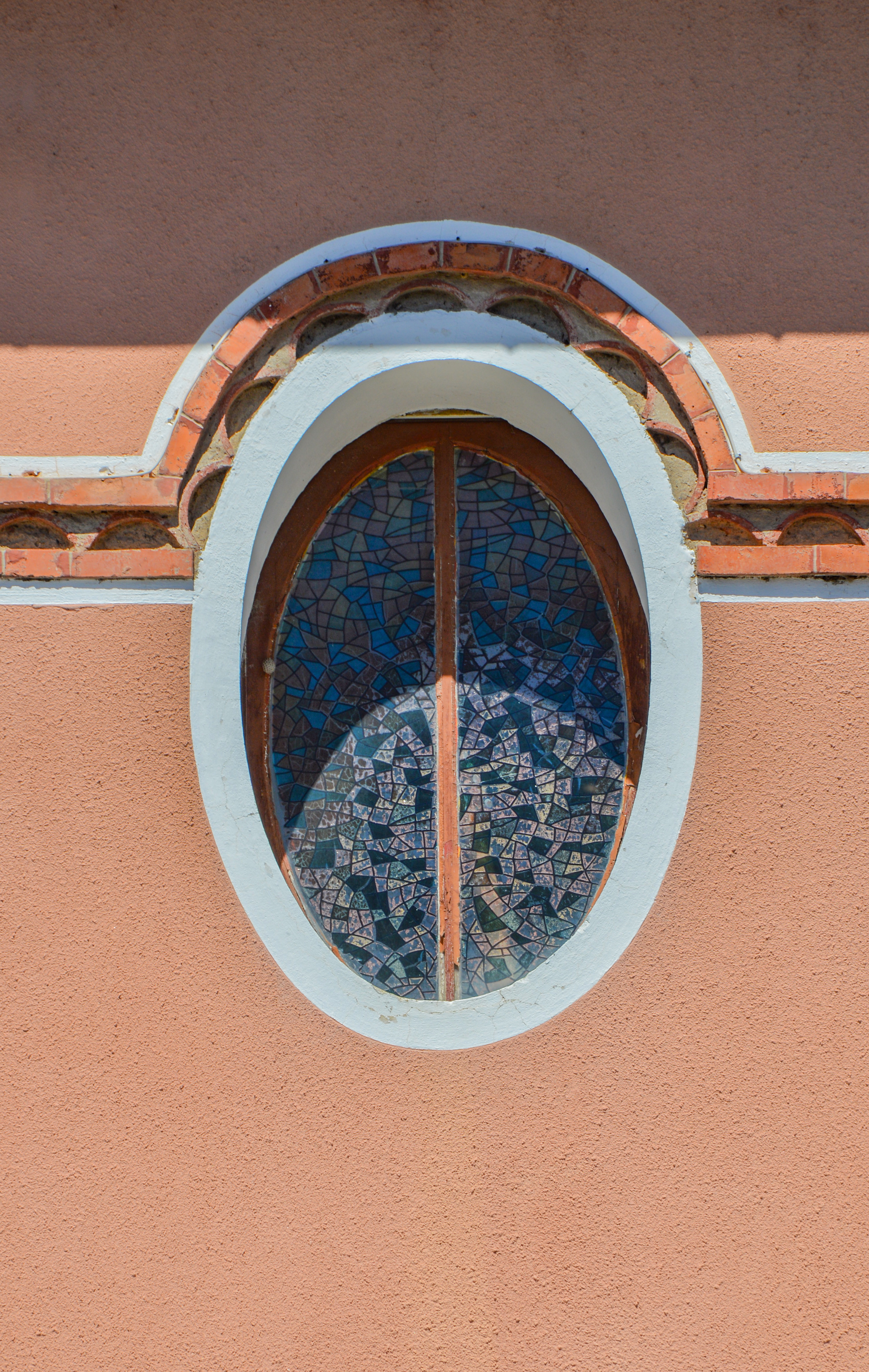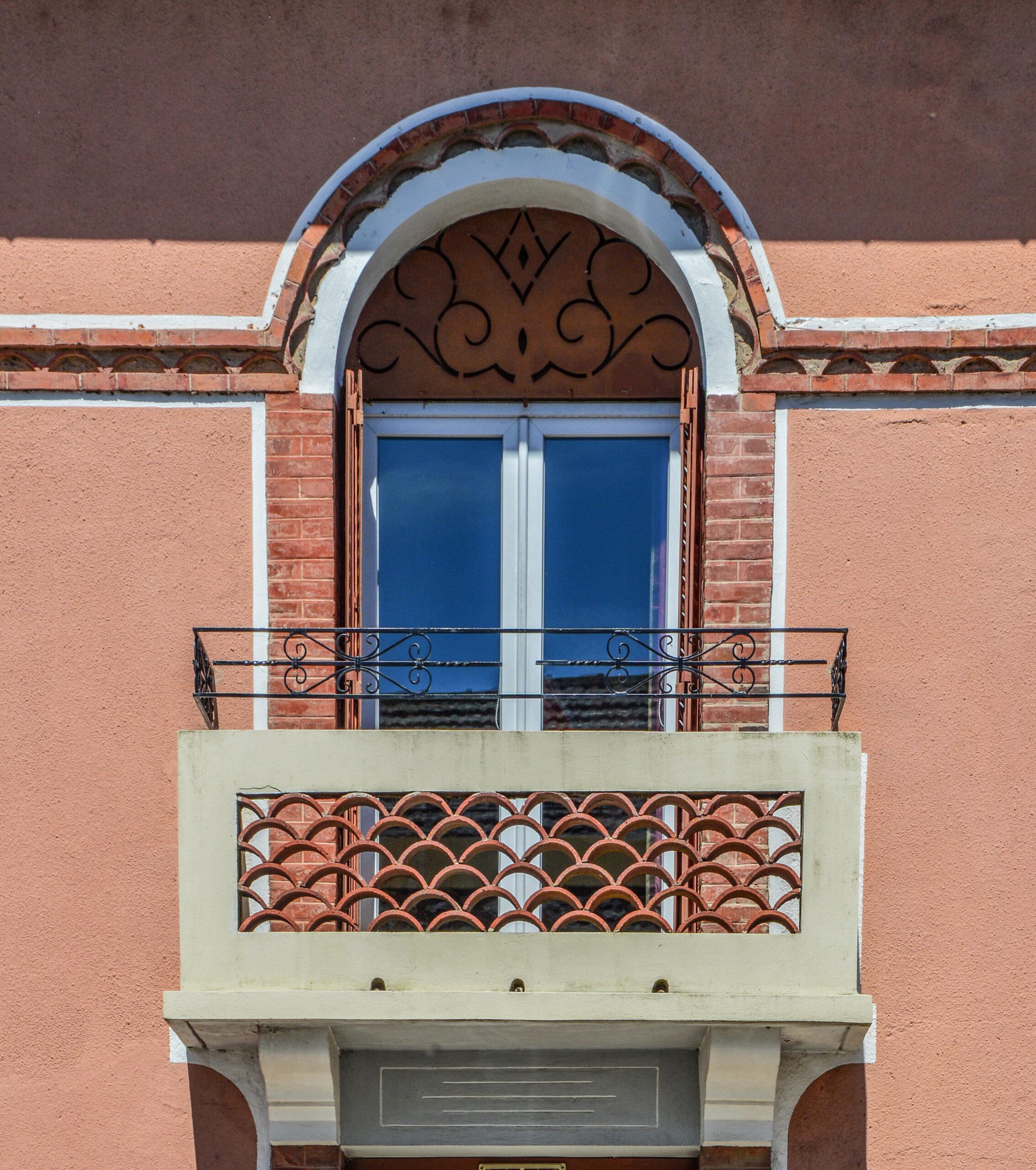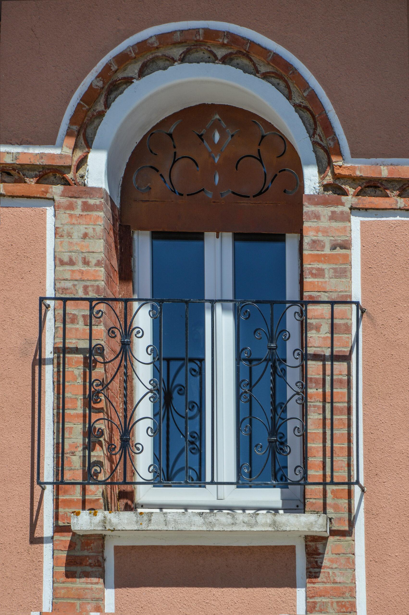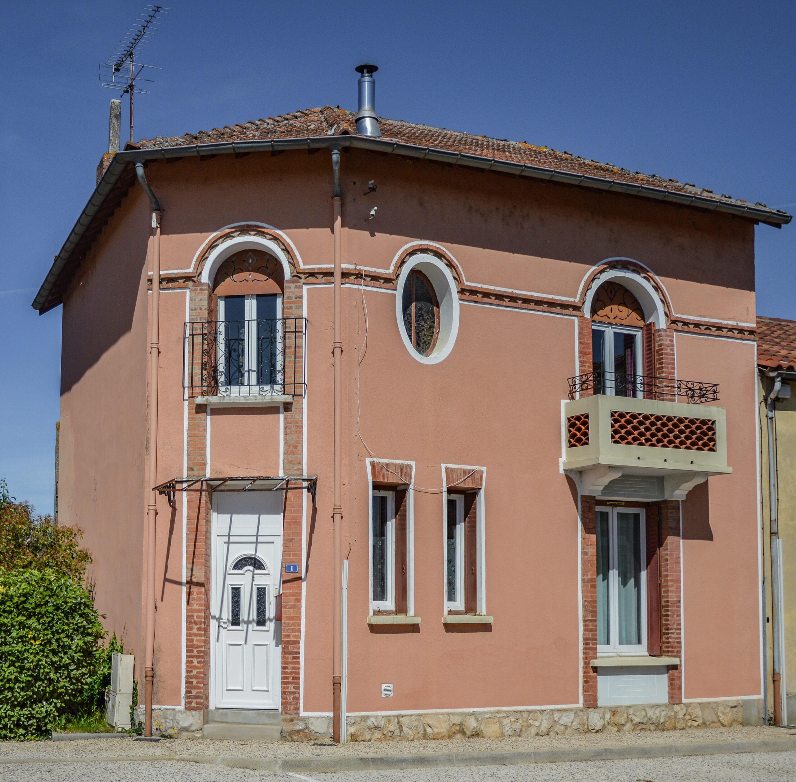 Cette façade symétrique forme un angle et comporte un soubassement en moellons puis un enduit rosé, fidèle à la couleur d’époque. L’encadrement de la porte en briques rejoint celle de la fenêtre du premier étage, formant ainsi une continuité entre les deux niveaux que l’on retrouve également sur la droite. Les ouvertures du premier étage rejettent les angles ; ainsi deux fenêtres se terminent par un arc tandis que celle au centre est circulaire, en forme l’œil de bœuf clos par un vitrail très caractéristique de l’Art déco. Ces arrondis supérieurs sont reliés par une ornementation en forme de génoise à un rang encadré par des séries de briques. Le fer forgé est utilisé pour les garde-corps qui sont ornés de formes à spirales, mais aussi pour la marquise au-dessus de l’entrée.