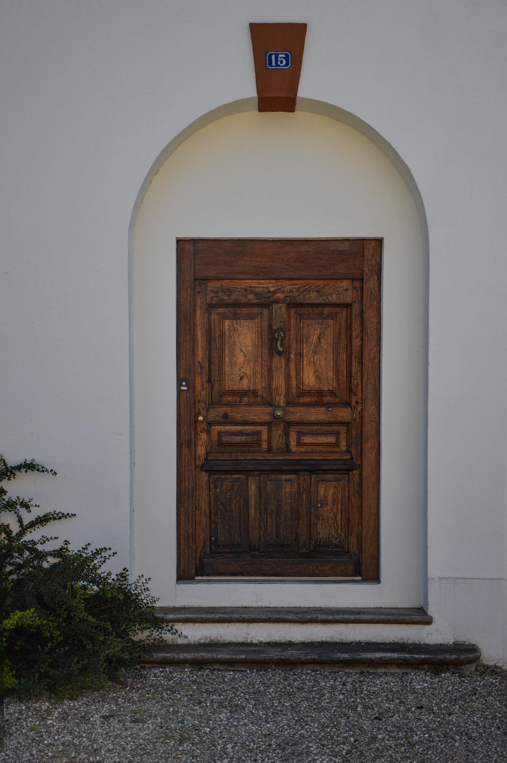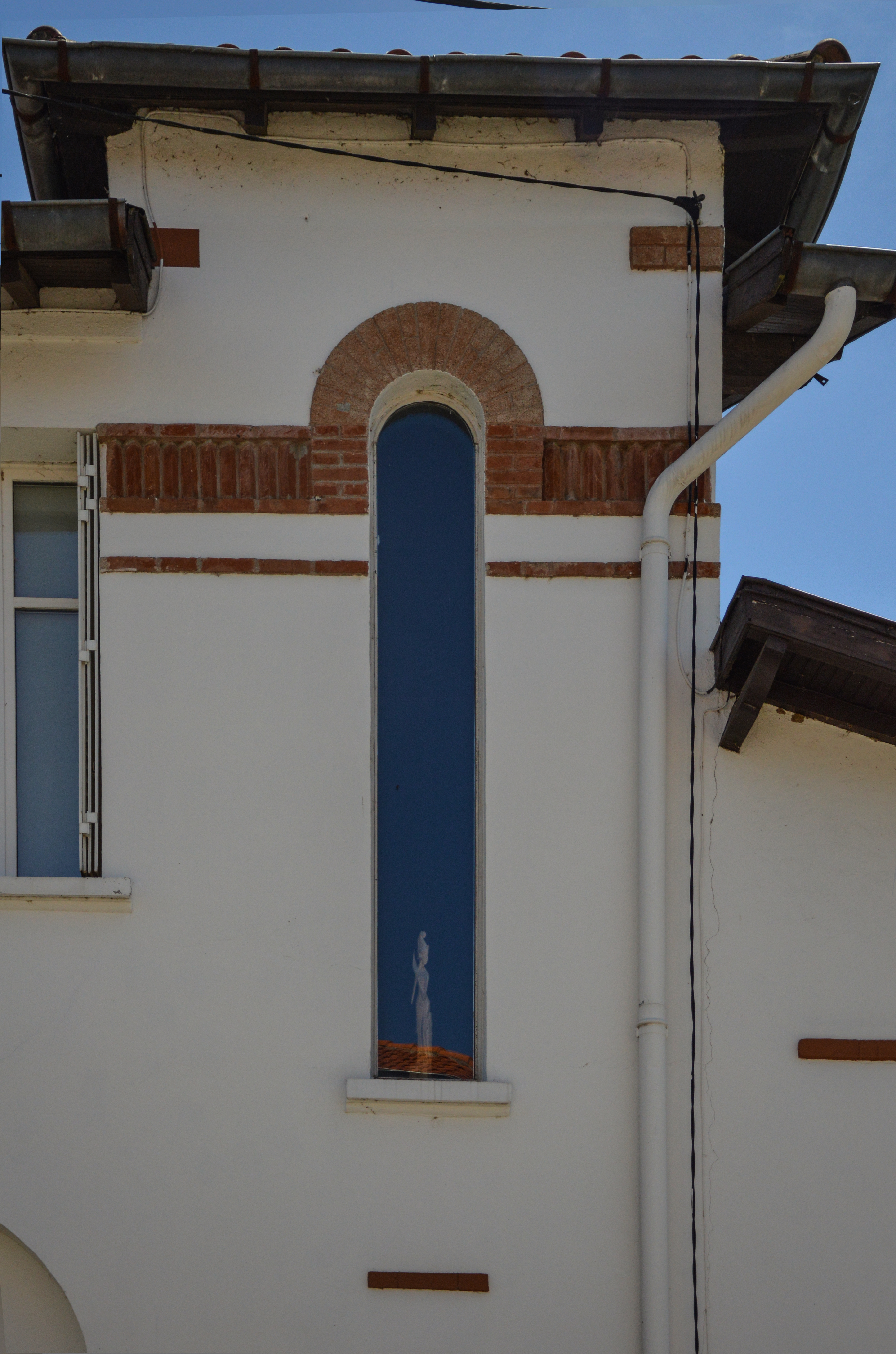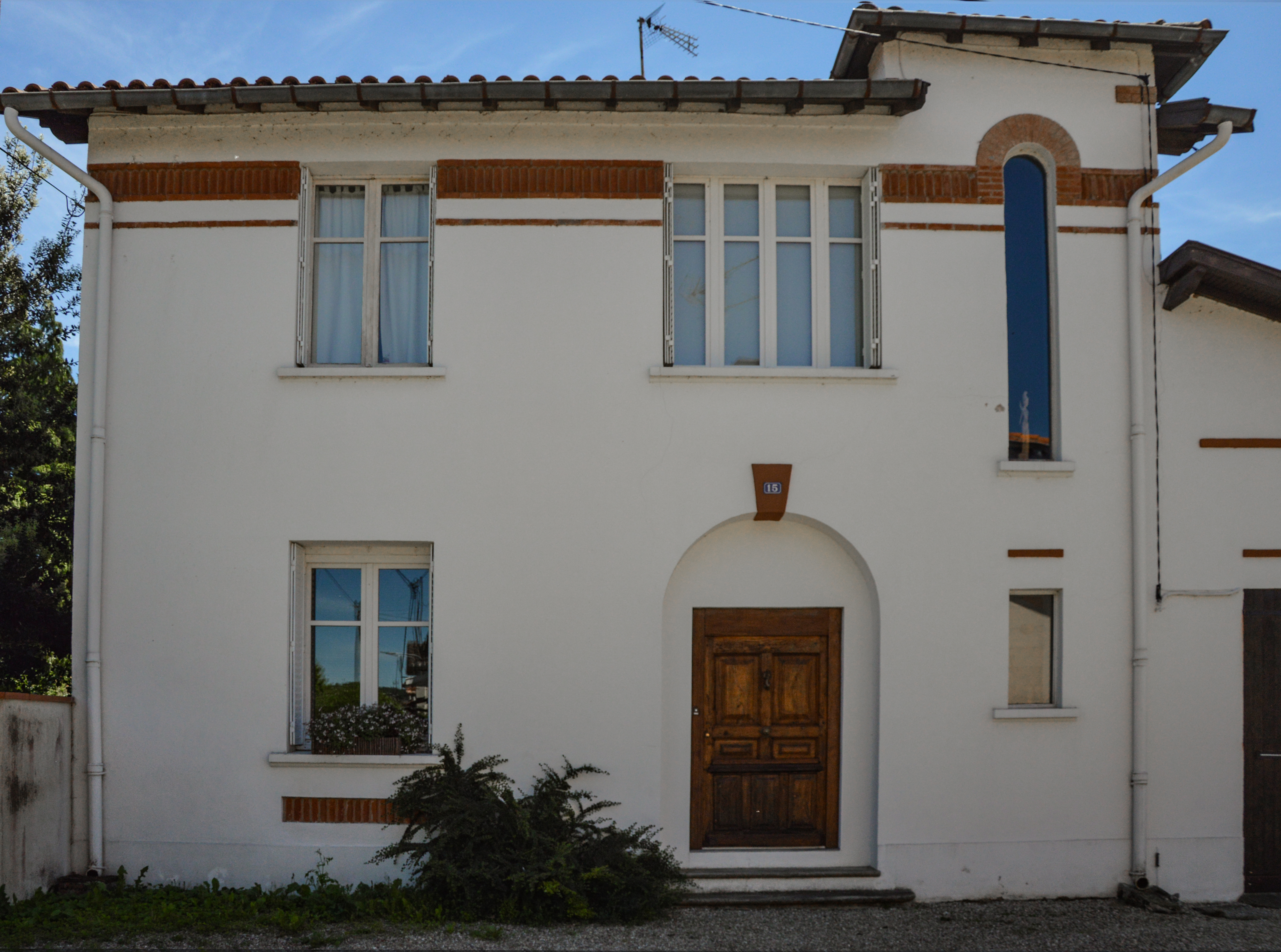 Un porche d’entrée est suggéré par un léger renfoncement dans la façade en arc. En enduit blanc, seules des briques soulignent les ouvertures et ornent la partie supérieure de la façade. Une baie allongée se terminant par un arc déstructure la façade et est typique de l’Art déco qui valorisait la lumière et l’aspect sanitaire dans les maisons.