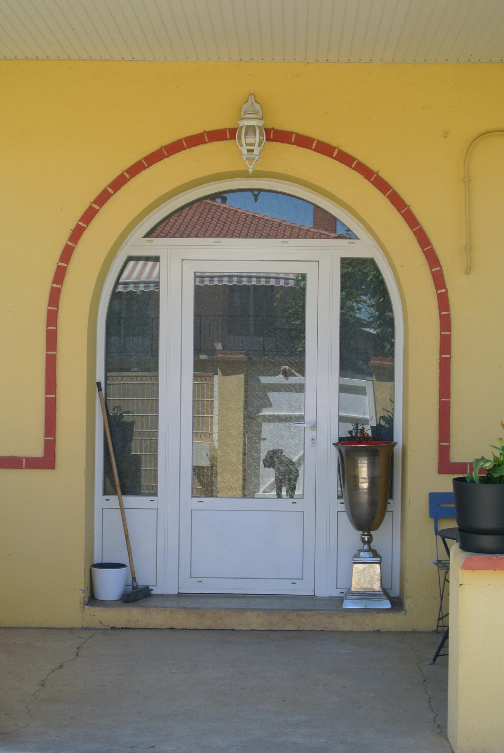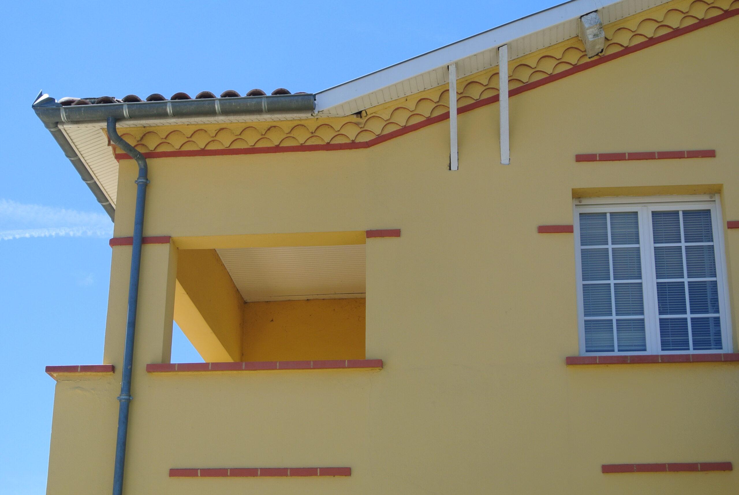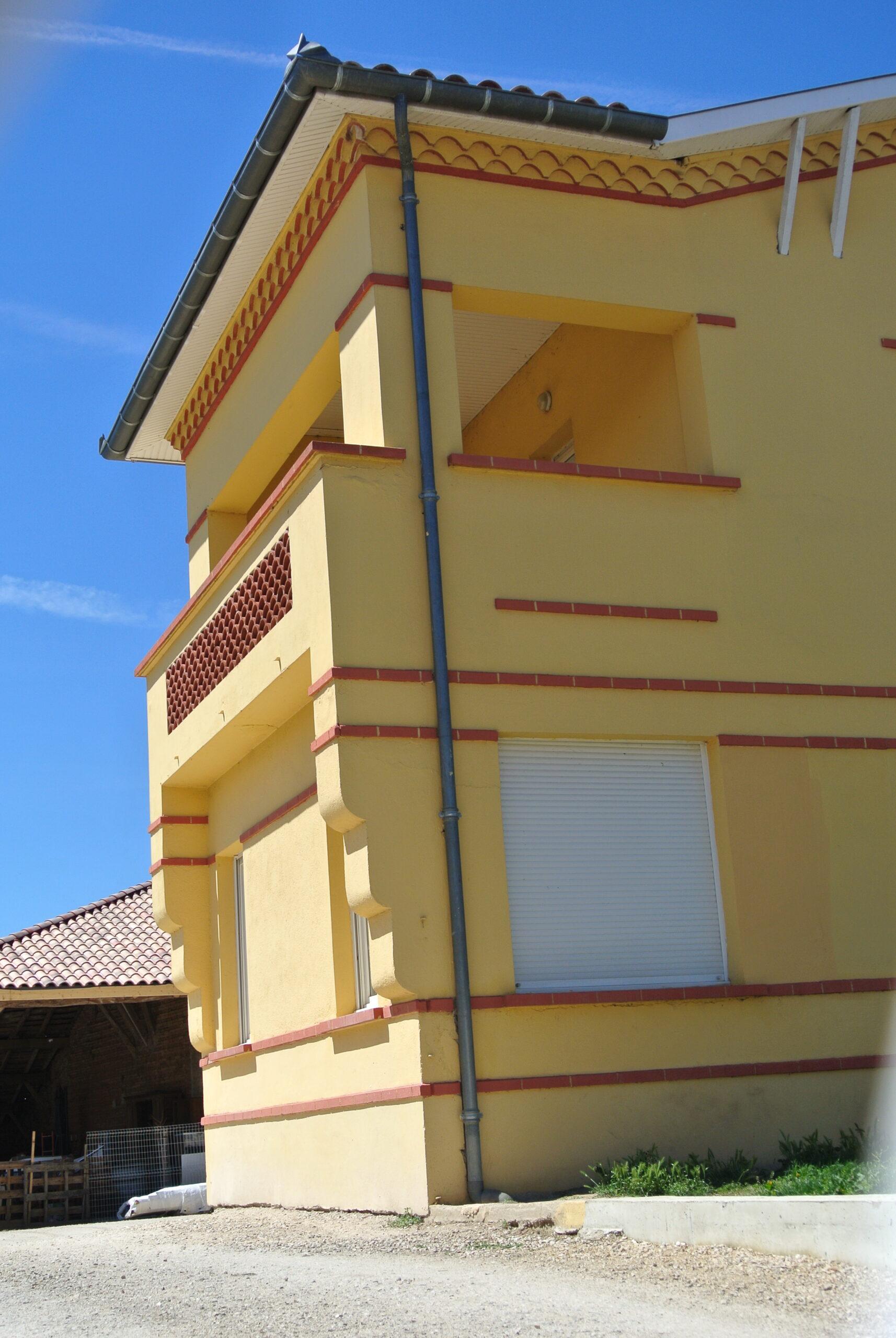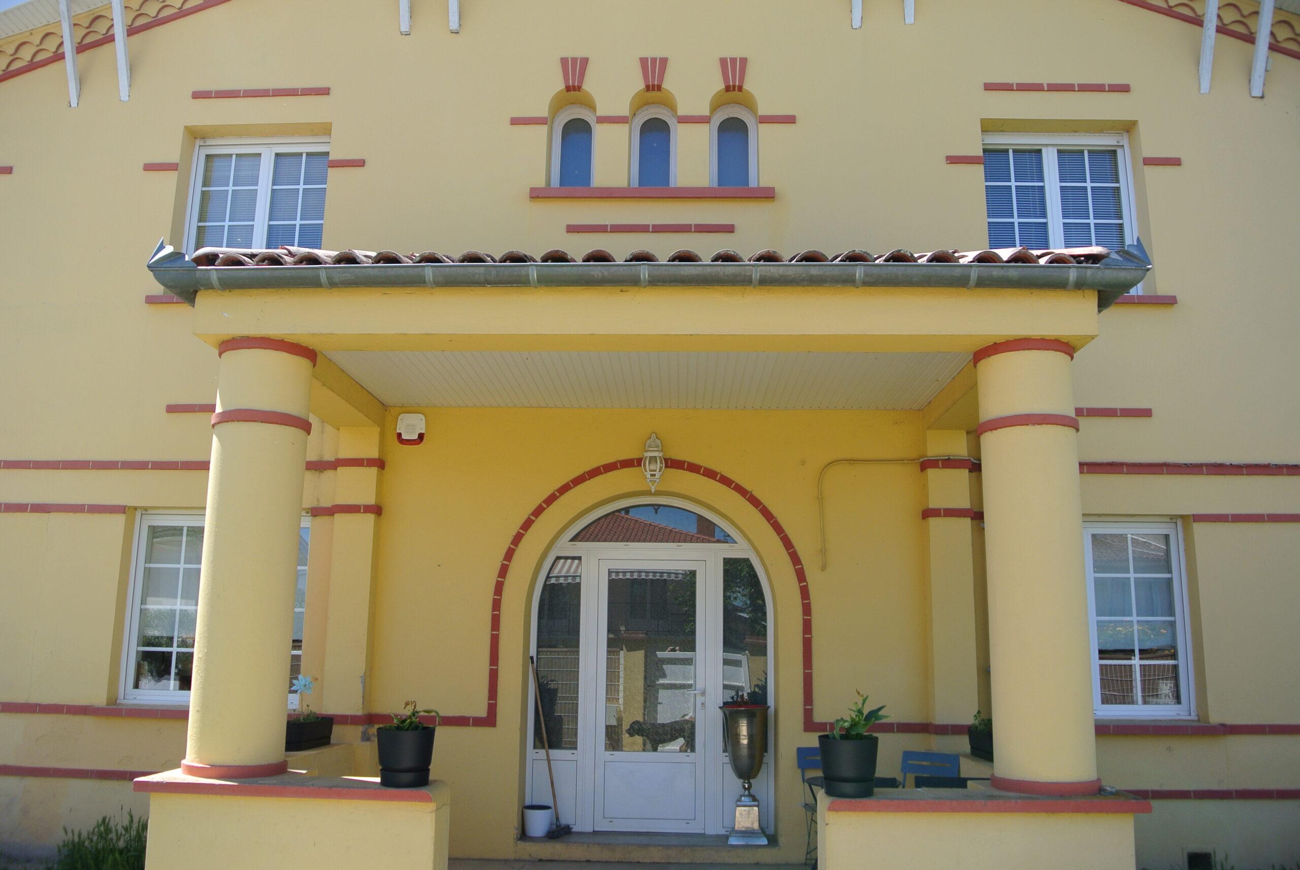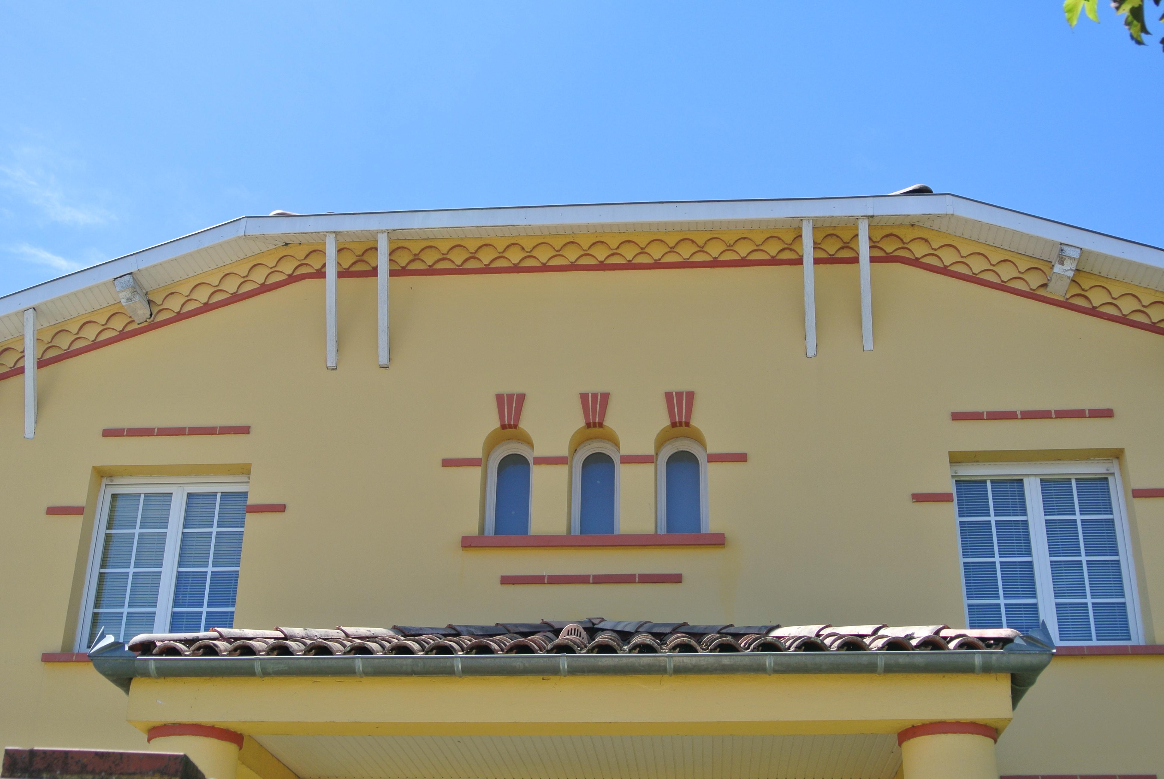 Bâtisse restaurée récemment avec une volonté de garder l’esprit et les couleurs d’époque, cette maison à toit en pans coupés montre une façade en enduit jaune rythmé par des séries de briques non saillantes qui soulignent les différents niveaux et les ouvertures. Une génoise à deux rangs en dessous du débord de toit permet une ornementation supplémentaire, mais qui n’est présent que sur la façade principale. Le porche ouvert devant l’entrée est rejeté de la façade et son toit est soutenu par des colonnes. Un balcon s’ouvre sur la gauche dont le toit plus bas que le reste de la bâtisse est possible grâce au toit à pans coupés.